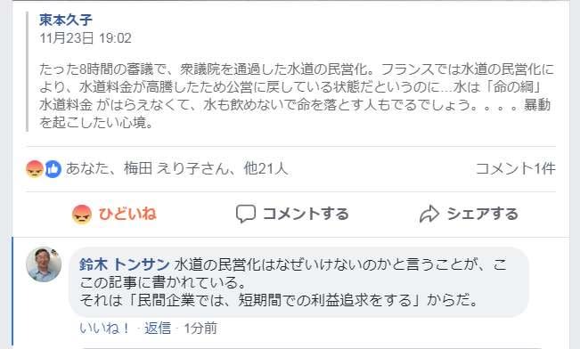 11月27日(火) 曇り今日見たFacebookから。公共のインフラは、民営化してはいけない。